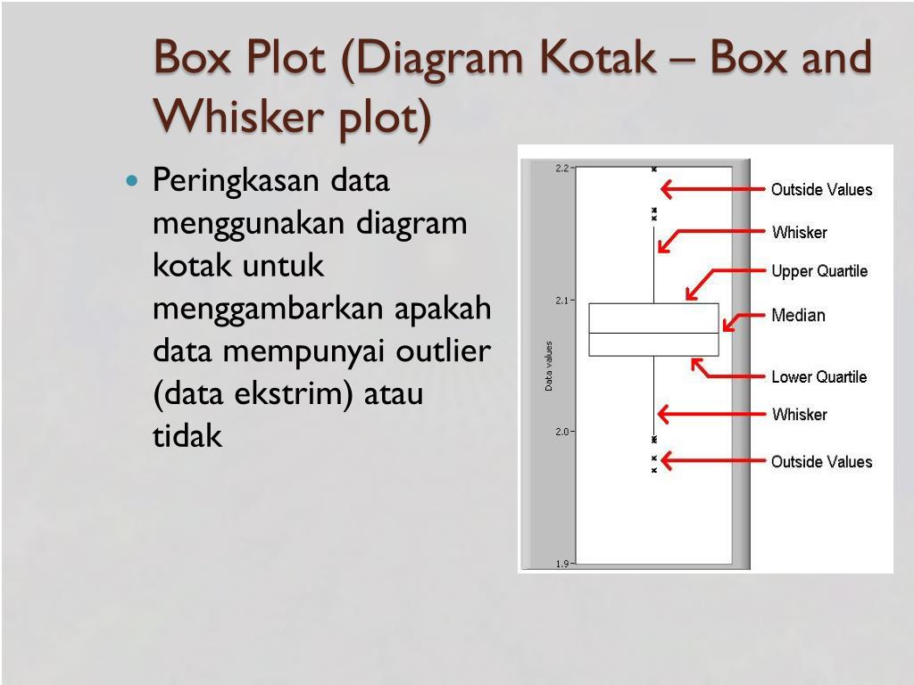 Box Plot (Diagram Kotak – Box and Whisker plot) • Peringkasan data menggunakan diagram kotakuntukmenggambarkanapakah data mempunyai outlier (data ekstrim) atautidak