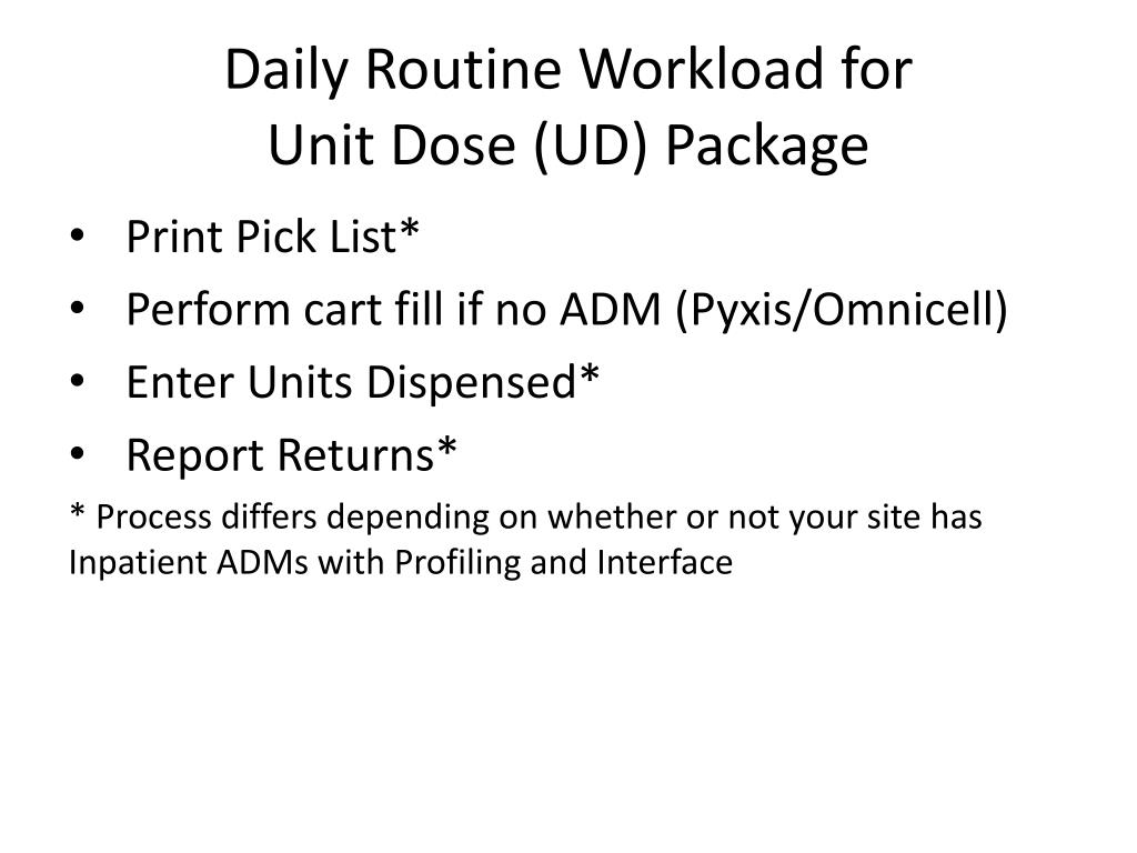 Daily Routine Workload for Unit Dose (UD) Package • Print Pick List* • Perform cart fill if no ADM (Pyxis/Omnicell) • Enter Units Dispensed* • Report Returns* * Process differs depending on whether or not your site has Inpatient ADMs with Profiling and Interface