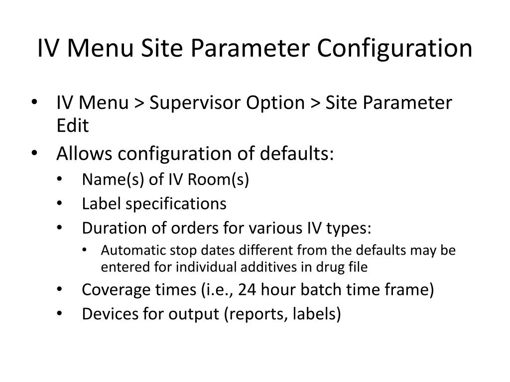 IV Menu Site Parameter Configuration • IV Menu > Supervisor Option > Site Parameter Edit • Allows configuration of defaults: • Name(s) of IV Room(s) • Label specifications • Duration of orders for various IV types: • Automatic stop dates different from the defaults may be entered for individual additives in drug file • Coverage times (i.e., 24 hour batch time frame) • Devices for output (reports, labels)