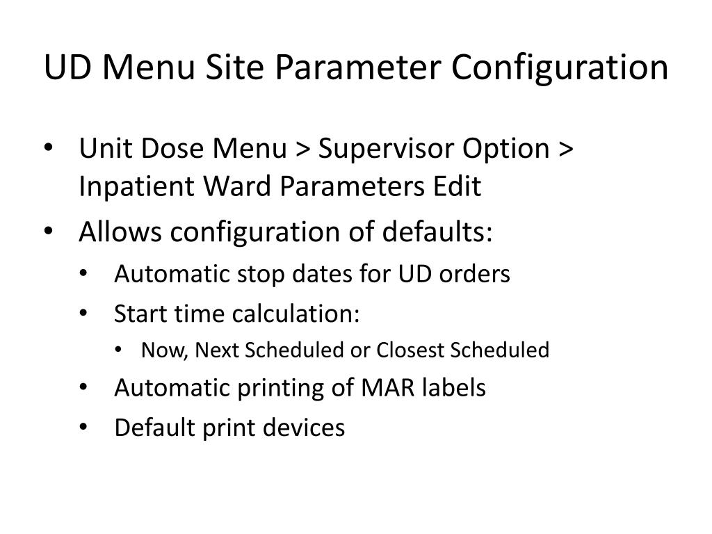 UD Menu Site Parameter Configuration • Unit Dose Menu > Supervisor Option > Inpatient Ward Parameters Edit • Allows configuration of defaults: • Automatic stop dates for UD orders • Start time calculation: • Now, Next Scheduled or Closest Scheduled • Automatic printing of MAR labels • Default print devices