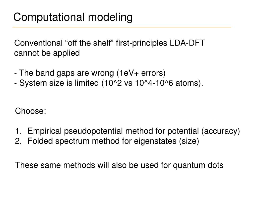 Computational modeling Conventional “off the shelf” first-principles LDA-DFT cannot be applied - The band gaps are wrong (1eV+ errors) - System size is limited (10^2 vs 10^4-10^6 atoms). Choose: Empirical pseudopotential method for potential (accuracy) Folded spectrum method for eigenstates (size) These same methods will also be used for quantum dots