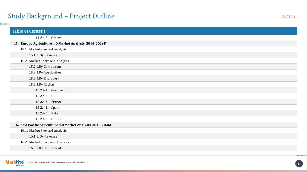 Document Outline 02 Research Scope Report Particulars, Key Questions Answered, Market Segmentation, Table of Content Sample Illustration Global Agriculture 4.0 Market Analysis, 2021 18 • Research Process & Methodology • Research Approach, Research Methodology 56 65 Commercials Company Profile About the Company 67 69 Disclaimer & Contact Details