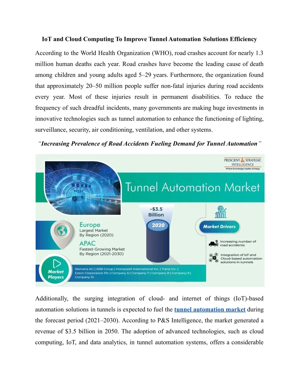 IoT and Cloud Computing To Improve Tunnel Automation Solutions Efficiency According to the World Health Organization (WHO), road crashes account for nearly 1.3 million human deaths each year. Road crashes have become the leading cause of death among children and young adults aged 5–29 years. Furthermore, the organization found that approximately 20–50 million people suffer non-fatal injuries during road accidents every year. Most of these injuries result in permanent disabilities. To reduce the frequency of such dreadful incidents, many governments are making huge investments in innovative technologies such as tunnel automation to enhance the functioning of lighting, surveillance, security, air conditioning, ventilation, and other systems. “Increasing Prevalence of Road Accidents Fueling Demand for Tunnel Automation” Additionally, the surging integration of cloud- and internet of things (IoT)-based automation solutions in tunnels is expected to fuel the tunnel automation market during the forecast period (2021–2030). According to P&S Intelligence, the market generated a revenue of $3.5 billion in 2050. The adoption of advanced technologies, such as cloud computing, IoT, and data analytics, in tunnel automation systems, offers a considerable