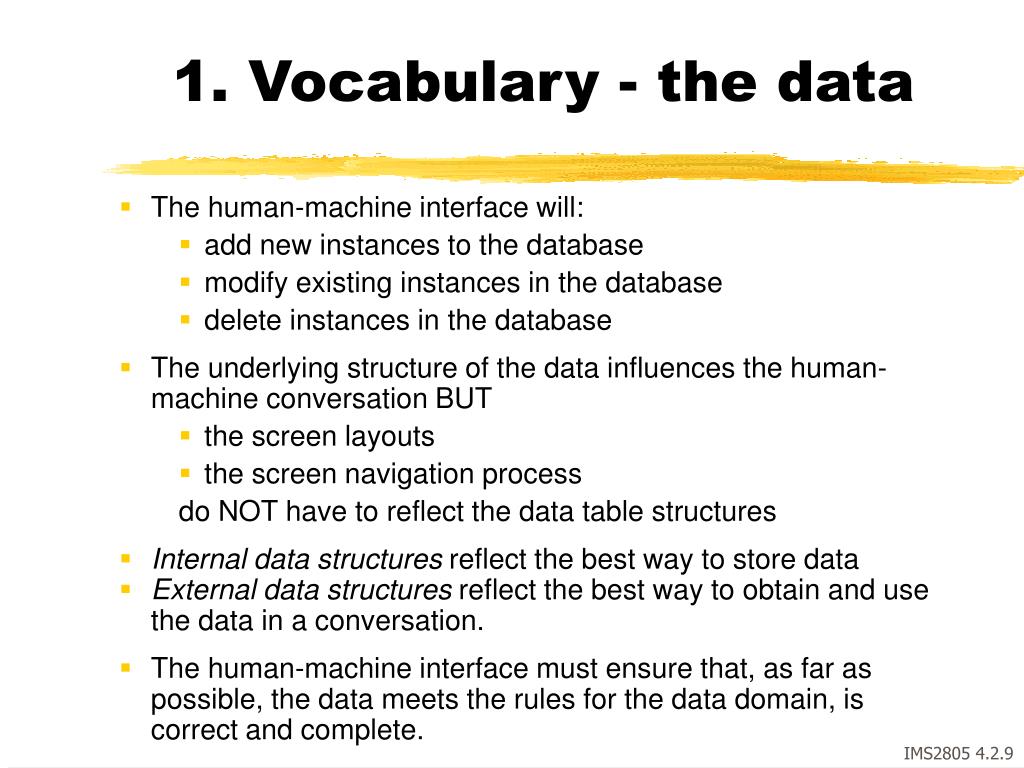 1. Vocabulary - the data • The human-machine interface will: • add new instances to the database • modify existing instances in the database • delete instances in the database • The underlying structure of the data influences the human-machine conversation BUT • the screen layouts • the screen navigation process do NOT have to reflect the data table structures • Internal data structures reflect the best way to store data • External data structures reflect the best way to obtain and use the data in a conversation. • The human-machine interface must ensure that, as far as possible, the data meets the rules for the data domain, is correct and complete.