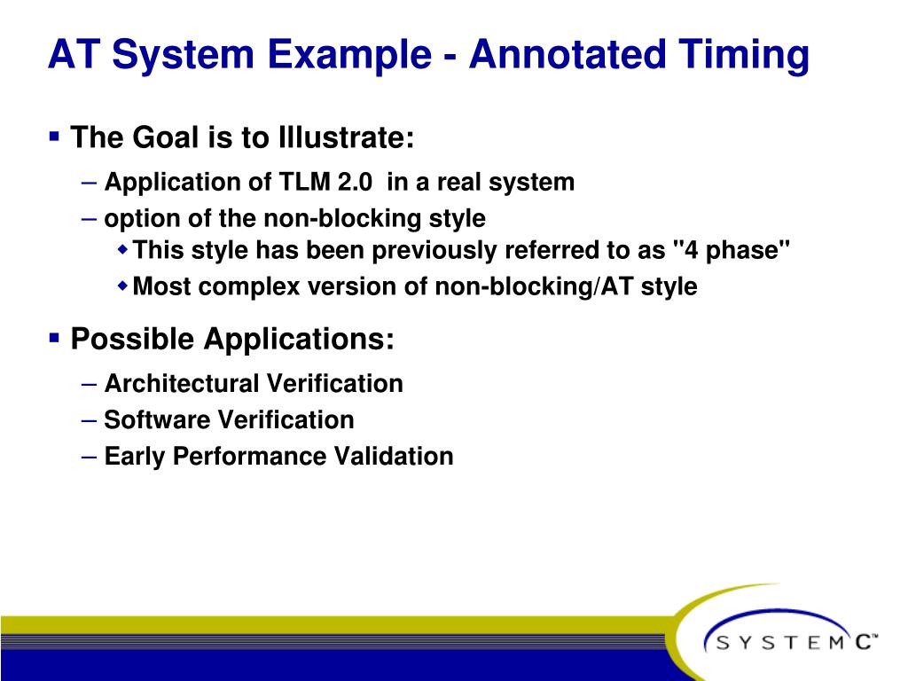 AT System Example - Annotated Timing • The Goal is to Illustrate: • Application of TLM 2.0 in a real system • option of the non-blocking style • This style has been previously referred to as "4 phase" • Most complex version of non-blocking/AT style • Possible Applications: • Architectural Verification • Software Verification • Early Performance Validation