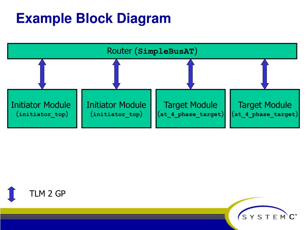 Example Block Diagram Router (SimpleBusAT) Initiator Module (initiator_top) Initiator Module (initiator_top) Target Module (at_4_phase_target) Target Module (at_4_phase_target) TLM 2 GP