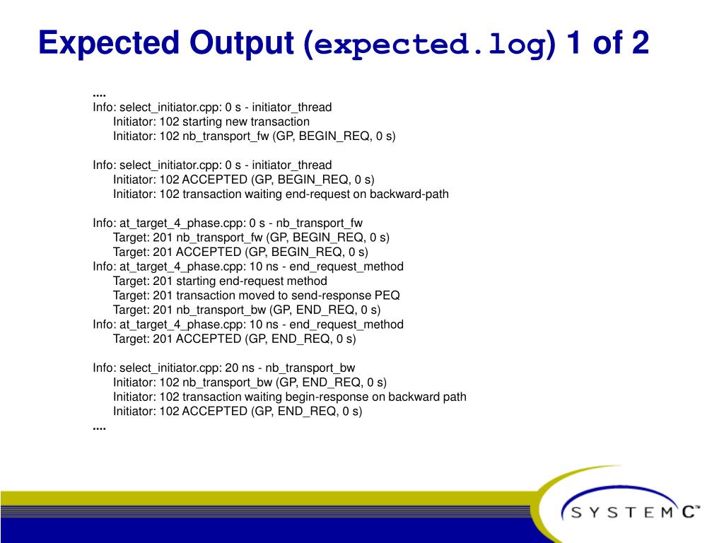 Expected Output (expected.log) 1 of 2 .... Info: select_initiator.cpp: 0 s - initiator_thread Initiator: 102 starting new transaction Initiator: 102 nb_transport_fw (GP, BEGIN_REQ, 0 s) Info: select_initiator.cpp: 0 s - initiator_thread Initiator: 102 ACCEPTED (GP, BEGIN_REQ, 0 s) Initiator: 102 transaction waiting end-request on backward-path Info: at_target_4_phase.cpp: 0 s - nb_transport_fw Target: 201 nb_transport_fw (GP, BEGIN_REQ, 0 s) Target: 201 ACCEPTED (GP, BEGIN_REQ, 0 s) Info: at_target_4_phase.cpp: 10 ns - end_request_method Target: 201 starting end-request method Target: 201 transaction moved to send-response PEQ Target: 201 nb_transport_bw (GP, END_REQ, 0 s) Info: at_target_4_phase.cpp: 10 ns - end_request_method Target: 201 ACCEPTED (GP, END_REQ, 0 s) Info: select_initiator.cpp: 20 ns - nb_transport_bw Initiator: 102 nb_transport_bw (GP, END_REQ, 0 s) Initiator: 102 transaction waiting begin-response on backward path Initiator: 102 ACCEPTED (GP, END_REQ, 0 s) ....