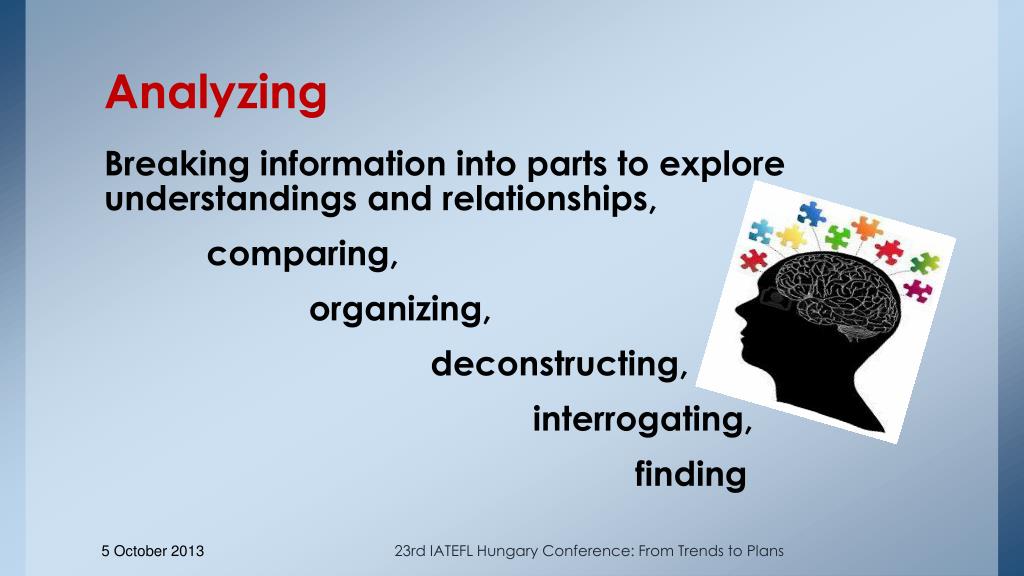 Analyzing Breaking information into parts to explore understandings and relationships, comparing, organizing, deconstructing, interrogating, finding 23rd IATEFL Hungary Conference: From Trends to Plans