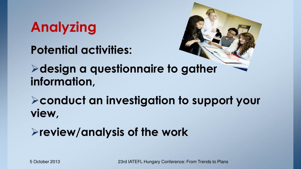 Analyzing Potential activities: • design a questionnaire to gather information, • conduct an investigation to support your view, • review/analysis of the work 23rd IATEFL Hungary Conference: From Trends to Plans