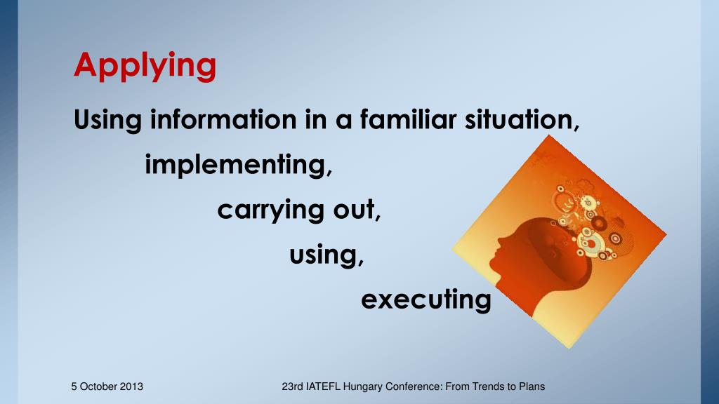 Applying Using information in a familiar situation, implementing, carrying out, using, executing 23rd IATEFL Hungary Conference: From Trends to Plans