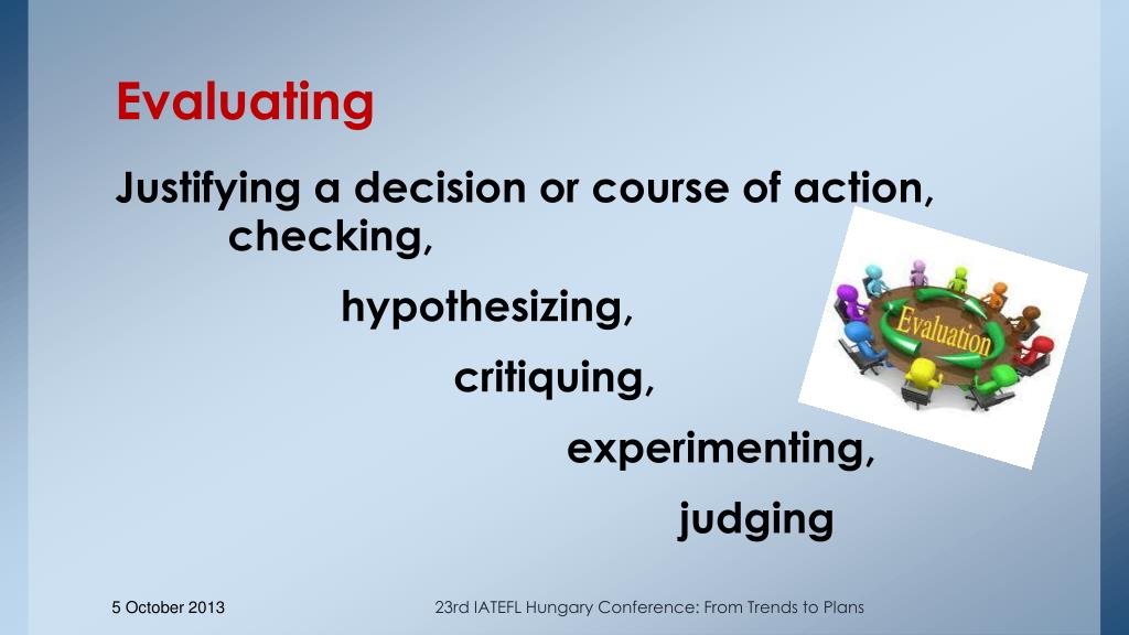 Evaluating Justifying a decision or course of action, checking, hypothesizing, critiquing, experimenting, judging 23rd IATEFL Hungary Conference: From Trends to Plans