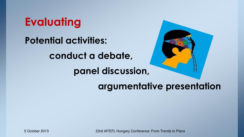 Evaluating Potential activities: conduct a debate, panel discussion, argumentative presentation 23rd IATEFL Hungary Conference: From Trends to Plans