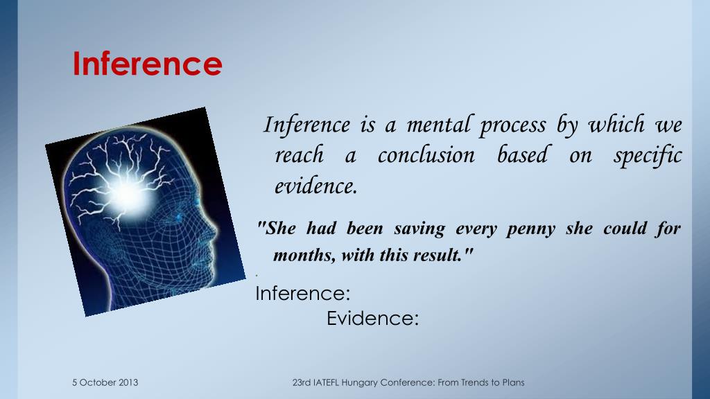 Inference is a mental process by which we reach a conclusion based on specific evidence. "She had been saving every penny she could for months, with this result." Inference: Evidence: Inference 23rd IATEFL Hungary Conference: From Trends to Plans