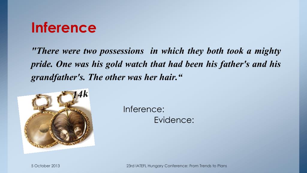 Inference "There were two possessions in which they both took a mighty pride. One was his gold watch that had been his father's and his grandfather's. The other was her hair.“ • Inference: • Evidence: 23rd IATEFL Hungary Conference: From Trends to Plans