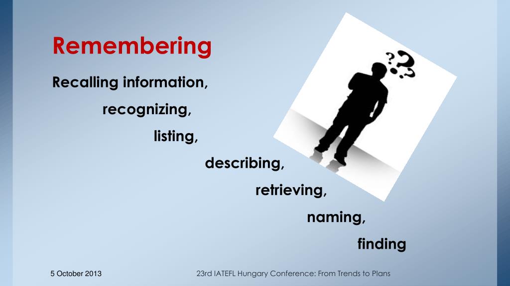 Remembering Recalling information, recognizing, listing, describing, retrieving, naming, finding 23rd IATEFL Hungary Conference: From Trends to Plans