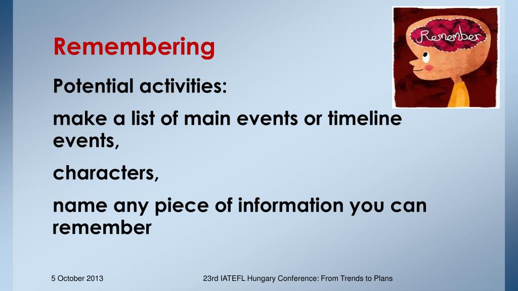 Remembering Potential activities: make a list of main events or timeline events, characters, name any piece of information you can remember 23rd IATEFL Hungary Conference: From Trends to Plans