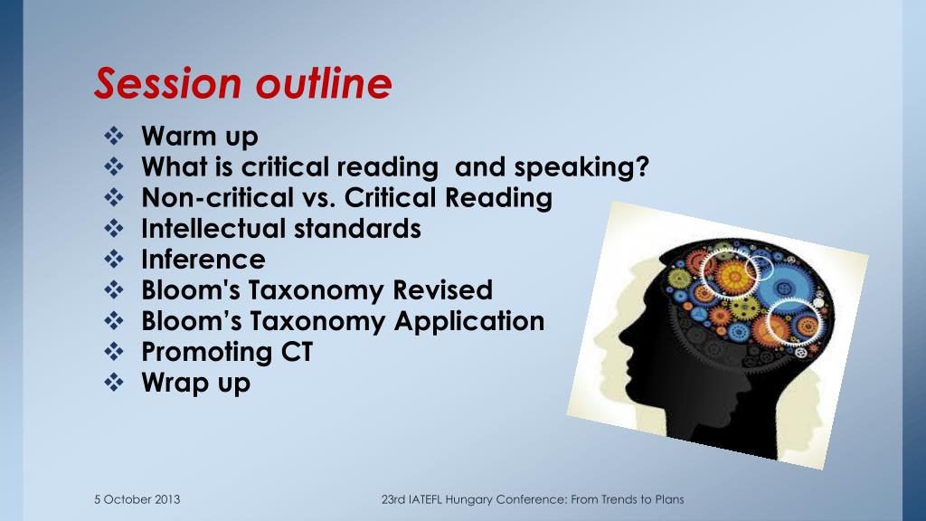 Session outline • Warm up • What is critical reading and speaking? • Non-critical vs. Critical Reading • Intellectual standards • Inference • Bloom's Taxonomy Revised • Bloom’s Taxonomy Application • Promoting CT • Wrap up 23rd IATEFL Hungary Conference: From Trends to Plans