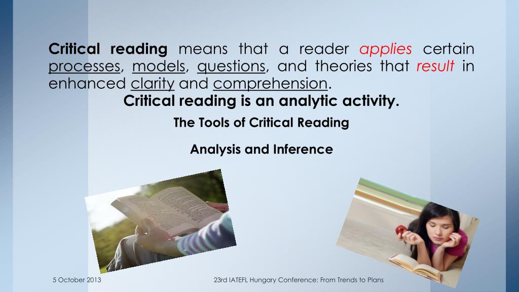 Critical reading means that a reader applies certain processes, models, questions, and theories that result in enhanced clarity and comprehension. Critical reading is an analytic activity. The Tools of Critical Reading Analysis and Inference 23rd IATEFL Hungary Conference: From Trends to Plans