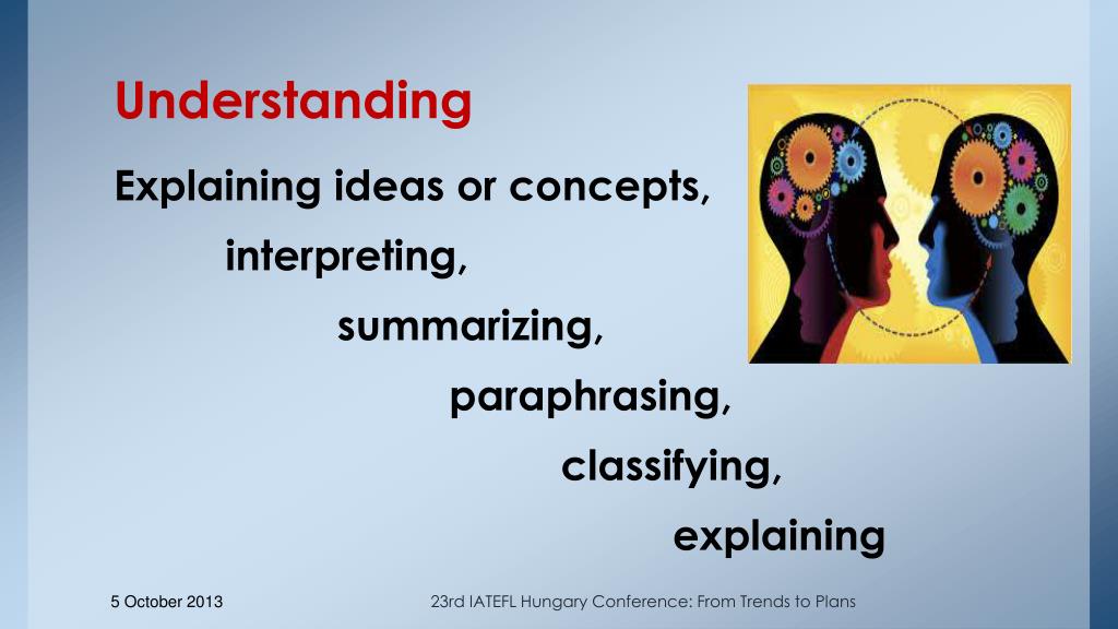 Understanding Explaining ideas or concepts, interpreting, summarizing, paraphrasing, classifying, explaining 23rd IATEFL Hungary Conference: From Trends to Plans