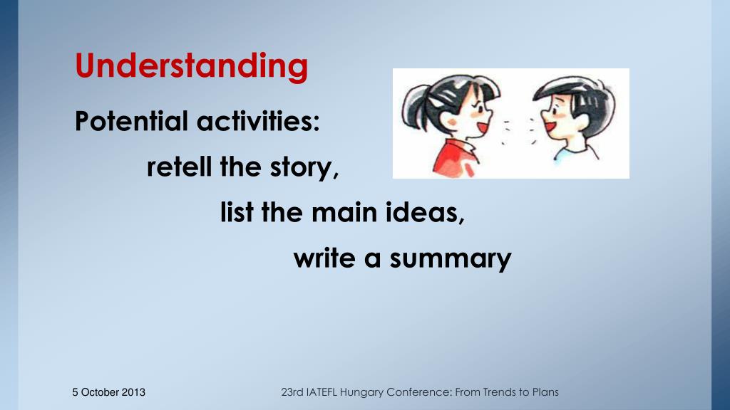 Understanding Potential activities: retell the story, list the main ideas, write a summary 23rd IATEFL Hungary Conference: From Trends to Plans