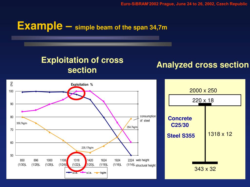 Euro-SiBRAM‘2002 Prague, June 24 to 26, 2002, Czech Republic Example – simple beam of the span 34,7m Exploitation of cross section Analyzed cross section 2000 x 250 220 x 18 Concrete C25/30 1318 x 12 Steel S355 343 x 32