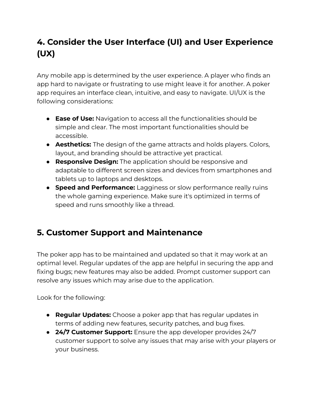 4. Consider the User Interface (UI) and User Experience (UX) Any mobile app is determined by the user experience. A player who finds an app hard to navigate or frustrating to use might leave it for another. A poker app requires an interface clean, intuitive, and easy to navigate. UI/UX is the following considerations: ● Ease of Use: Navigation to access all the functionalities should be simple and clear. The most important functionalities should be accessible. ● Aesthetics: The design of the game attracts and holds players. Colors, layout, and branding should be attractive yet practical. ● Responsive Design: The application should be responsive and adaptable to different screen sizes and devices from smartphones and tablets up to laptops and desktops. ● Speed and Performance: Lagginess or slow performance really ruins the whole gaming experience. Make sure it's optimized in terms of speed and runs smoothly like a thread. 5. Customer Support and Maintenance The poker app has to be maintained and updated so that it may work at an optimal level. Regular updates of the app are helpful in securing the app and fixing bugs; new features may also be added. Prompt customer support can resolve any issues which may arise due to the application. Look for the following: ● Regular Updates: Choose a poker app that has regular updates in terms of adding new features, security patches, and bug fixes. ● 24/7 Customer Support: Ensure the app developer provides 24/7 customer support to solve any issues that may arise with your players or your business.