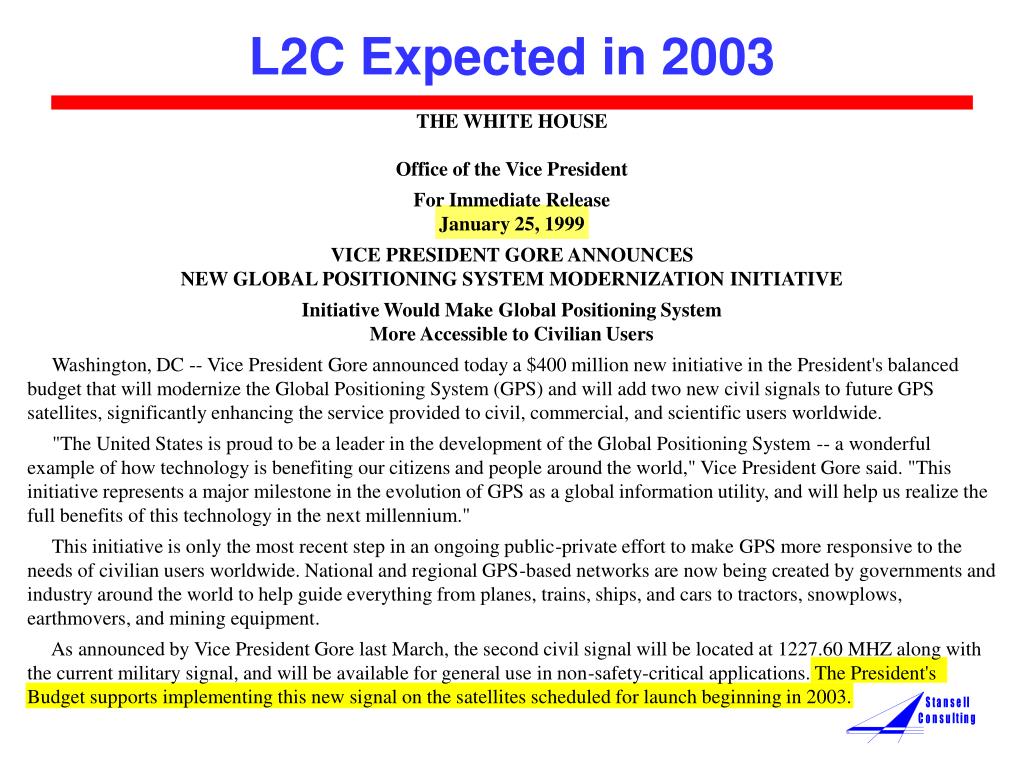 L2C Expected in 2003 THE WHITE HOUSEOffice of the Vice President For Immediate ReleaseJanuary 25, 1999 VICE PRESIDENT GORE ANNOUNCES NEW GLOBAL POSITIONING SYSTEM MODERNIZATION INITIATIVE Initiative Would Make Global Positioning SystemMore Accessible to Civilian Users Washington, DC -- Vice President Gore announced today a $400 million new initiative in the President's balanced budget that will modernize the Global Positioning System (GPS) and will add two new civil signals to future GPS satellites, significantly enhancing the service provided to civil, commercial, and scientific users worldwide. "The United States is proud to be a leader in the development of the Global Positioning System -- a wonderful example of how technology is benefiting our citizens and people around the world," Vice President Gore said. "This initiative represents a major milestone in the evolution of GPS as a global information utility, and will help us realize the full benefits of this technology in the next millennium." This initiative is only the most recent step in an ongoing public-private effort to make GPS more responsive to the needs of civilian users worldwide. National and regional GPS-based networks are now being created by governments and industry around the world to help guide everything from planes, trains, ships, and cars to tractors, snowplows, earthmovers, and mining equipment. As announced by Vice President Gore last March, the second civil signal will be located at 1227.60 MHZ along with the current military signal, and will be available for general use in non-safety-critical applications. The President's Budget supports implementing this new signal on the satellites scheduled for launch beginning in 2003.
