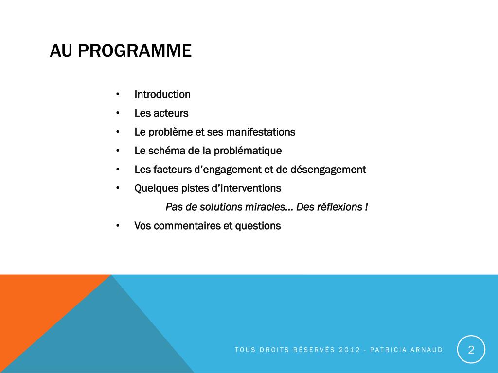 Au programme • Introduction • Les acteurs • Le problème et ses manifestations • Le schéma de la problématique • Les facteurs d’engagement et de désengagement • Quelques pistes d’interventions • Pas de solutions miracles… Des réflexions ! • Vos commentaires et questions Tousdroitsréservés 2012 - Patricia Arnaud