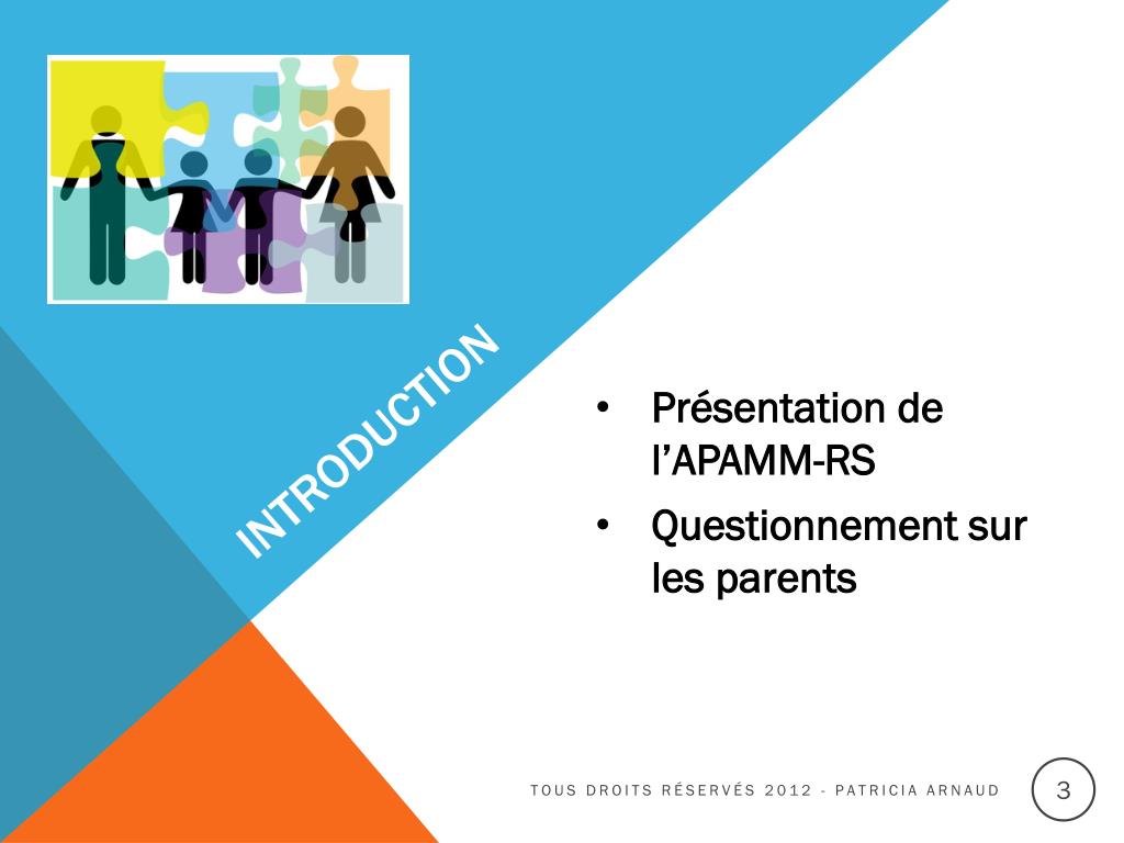 Introduction • Présentation de l’APAMM-RS • Questionnement sur les parents Tous droits réservés 2012 - Patricia Arnaud