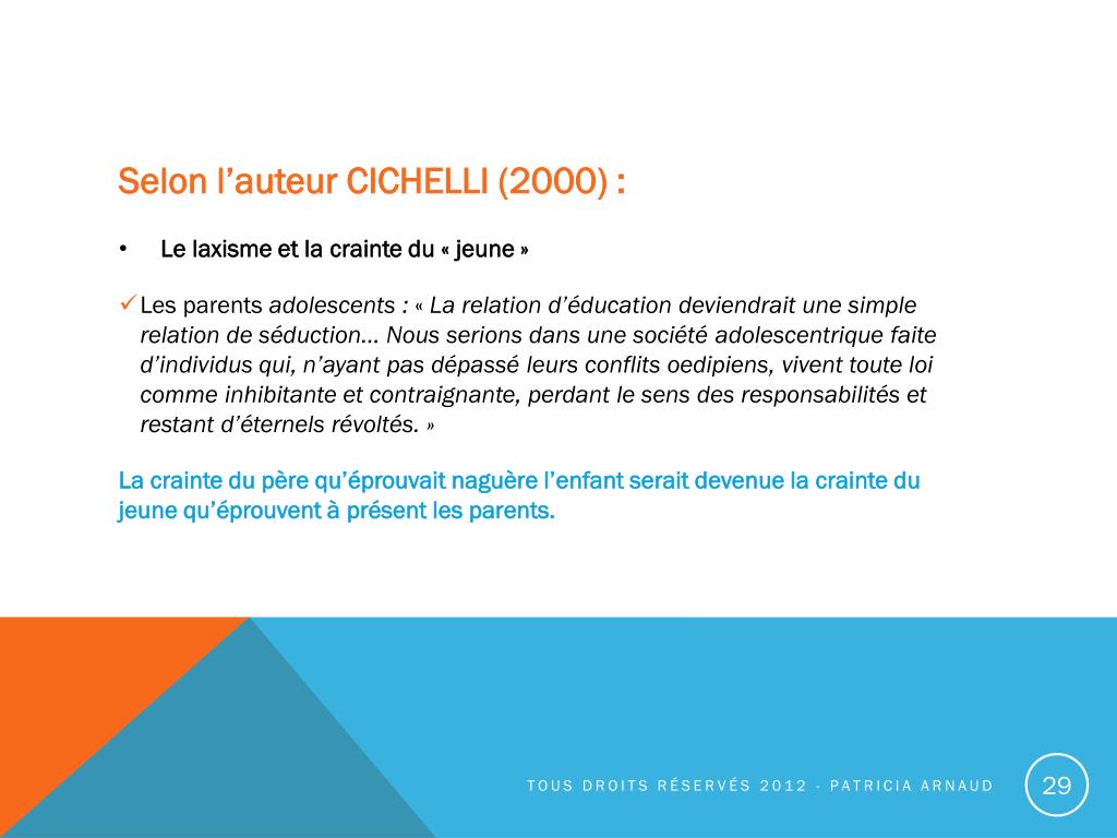 Selon l’auteur CICHELLI (2000) : • Le laxisme et la crainte du « jeune » • Les parents adolescents : « La relation d’éducation deviendrait une simple relation de séduction… Nous serions dans une société adolescentrique faite d’individus qui, n’ayant pas dépassé leurs conflits oedipiens, vivent toute loi comme inhibitante et contraignante, perdant le sens des responsabilités et restant d’éternels révoltés. » La crainte du père qu’éprouvait naguère l’enfant serait devenue la crainte du jeune qu’éprouvent à présent les parents. Tous droits réservés 2012 - Patricia Arnaud