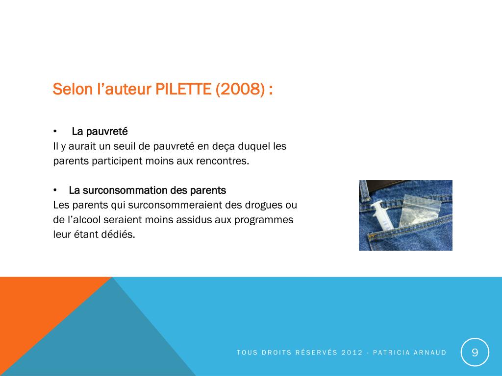 Selon l’auteur PILETTE (2008) : • La pauvreté • Il y aurait un seuil de pauvreté en deça duquel les • parents participent moins aux rencontres. • La surconsommation des parents • Les parents qui surconsommeraient des drogues ou • de l’alcool seraient moins assidus aux programmes • leur étant dédiés. Tous droits réservés 2012 - Patricia Arnaud