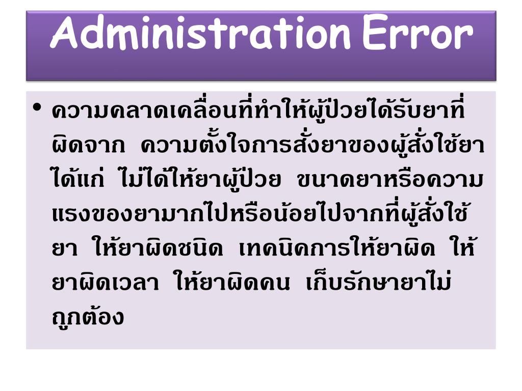 AdministrationError • ความคลาดเคลื่อนที่ทำให้ผู้ป่วยได้รับยาที่ผิดจาก ความตั้งใจการสั่งยาของผู้สั่งใช้ยา ได้แก่ ไม่ได้ให้ยาผู้ป่วย ขนาดยาหรือความแรงของยามากไปหรือน้อยไปจากที่ผู้สั่งใช้ยา ให้ยาผิดชนิด เทคนิคการให้ยาผิด ให้ยาผิดเวลา ให้ยาผิดคน เก็บรักษายาไม่ถูกต้อง