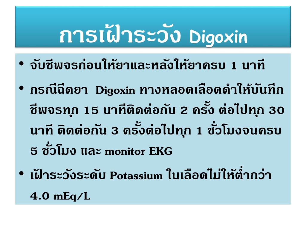 การเฝ้าระวังDigoxin • จับชีพจรก่อนให้ยาและหลังให้ยาครบ 1 นาที • กรณีฉีดยา Digoxinทางหลอดเลือดดำให้บันทึกชีพจรทุก 15 นาทีติดต่อกัน 2 ครั้ง ต่อไปทุก 30 นาที ติดต่อกัน 3 ครั้งต่อไปทุก 1 ชั่วโมงจนครบ 5 ชั่วโมง และ monitor EKG • เฝ้าระวังระดับ Potassium ในเลือดไม่ให้ต่ำกว่า 4.0 mEq/L