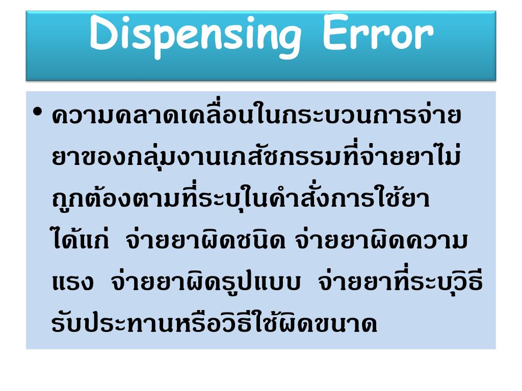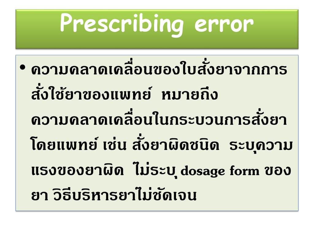 Prescribingerror • ความคลาดเคลื่อนของใบสั่งยาจากการสั่งใช้ยาของแพทย์ หมายถึง ความคลาดเคลื่อนในกระบวนการสั่งยาโดยแพทย์ เช่น สั่งยาผิดชนิด ระบุความแรงของยาผิด ไม่ระบุ dosage form ของยา วิธีบริหารยาไม่ชัดเจน