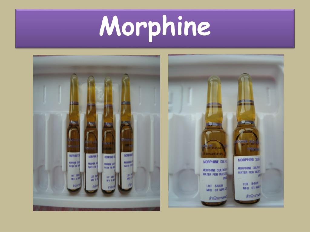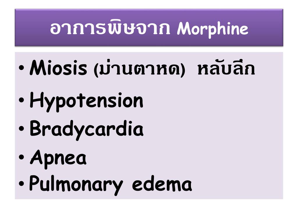 อาการพิษจาก Morphine • Miosis(ม่านตาหด) หลับลึก • Hypotension • Bradycardia • Apnea • Pulmonary edema
