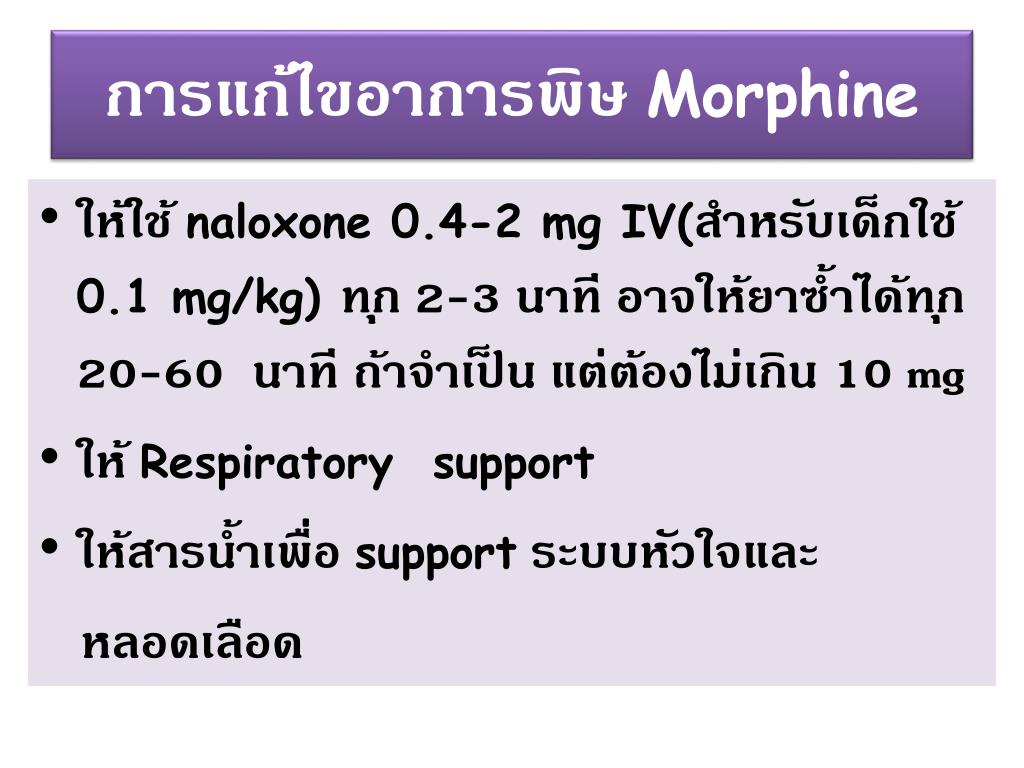 การแก้ไขอาการพิษMorphine • ให้ใช้ naloxone 0.4-2 mg IV(สำหรับเด็กใช้ 0.1 mg/kg) ทุก 2-3 นาที อาจให้ยาซ้ำได้ทุก 20-60 นาที ถ้าจำเป็น แต่ต้องไม่เกิน 10 mg • ให้ Respiratory support • ให้สารน้ำเพื่อ supportระบบหัวใจและ หลอดเลือด