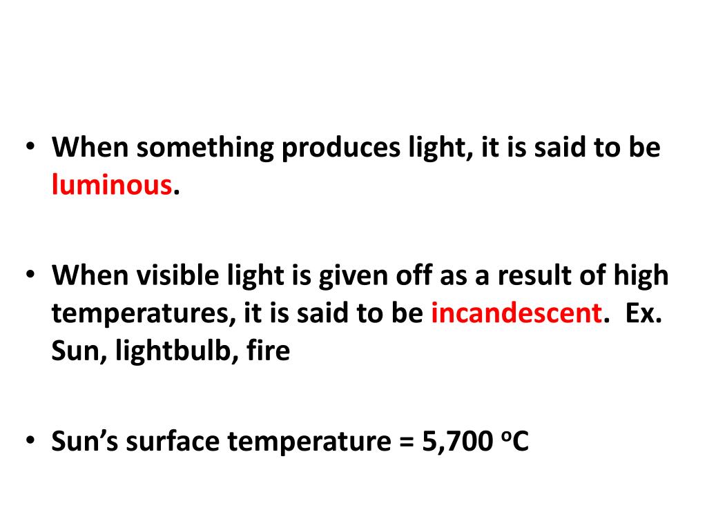 When something produces light, it is said to be luminous. • When visible light is given off as a result of high temperatures, it is said to be incandescent. Ex. Sun, lightbulb, fire • Sun’s surface temperature = 5,700 oC