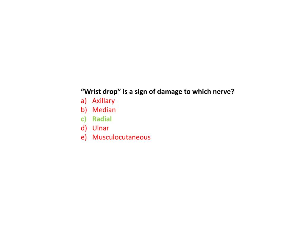 “Wrist drop” is a sign of damage to which nerve? Axillary Median Radial Ulnar Musculocutaneous
