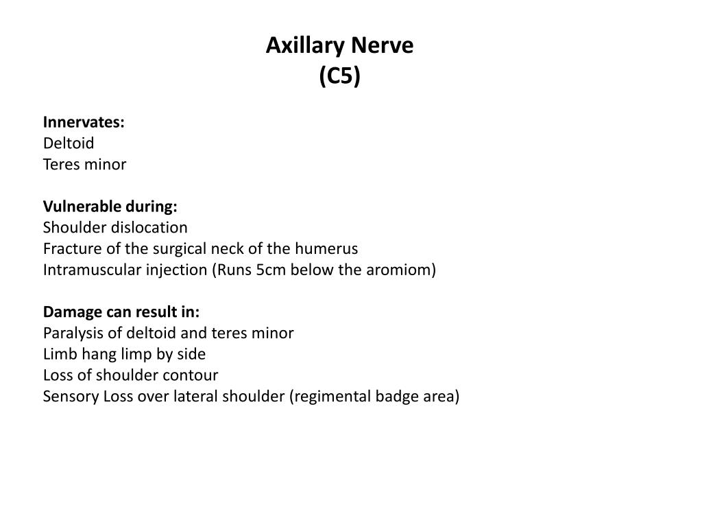 Axillary Nerve (C5) Innervates: Deltoid Teres minor Vulnerable during: Shoulder dislocation Fracture of the surgical neck of the humerus Intramuscular injection (Runs 5cm below the aromiom) Damage can result in: Paralysis of deltoid and teres minor Limb hang limp by side Loss of shoulder contour Sensory Loss over lateral shoulder (regimental badge area)