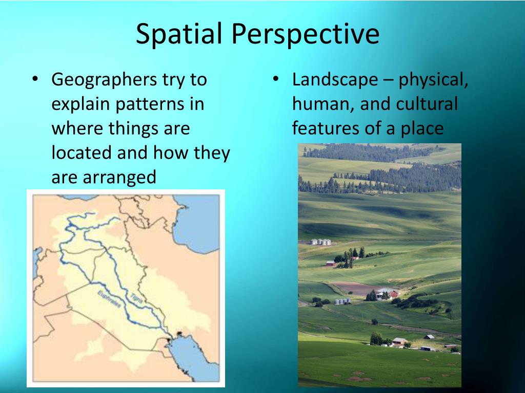 Spatial Perspective • Geographers try to explain patterns in where things are located and how they are arranged • Landscape – physical, human, and cultural features of a place