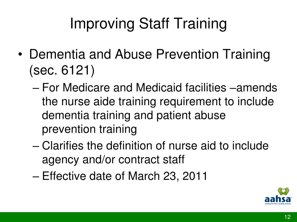 Improving Staff Training • Dementia and Abuse Prevention Training (sec. 6121) • For Medicare and Medicaid facilities –amends the nurse aide training requirement to include dementia training and patient abuse prevention training • Clarifies the definition of nurse aid to include agency and/or contract staff • Effective date of March 23, 2011