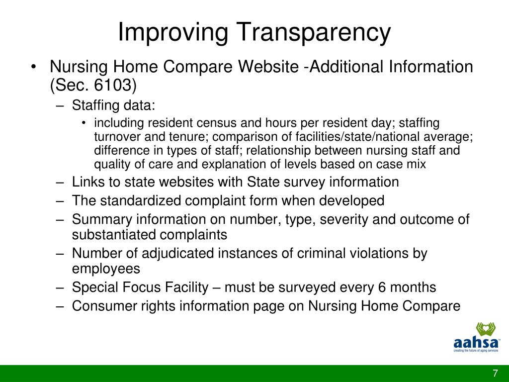 Improving Transparency • Nursing Home Compare Website -Additional Information (Sec. 6103) • Staffing data: • including resident census and hours per resident day; staffing turnover and tenure; comparison of facilities/state/national average; difference in types of staff; relationship between nursing staff and quality of care and explanation of levels based on case mix • Links to state websites with State survey information • The standardized complaint form when developed • Summary information on number, type, severity and outcome of substantiated complaints • Number of adjudicated instances of criminal violations by employees • Special Focus Facility – must be surveyed every 6 months • Consumer rights information page on Nursing Home Compare