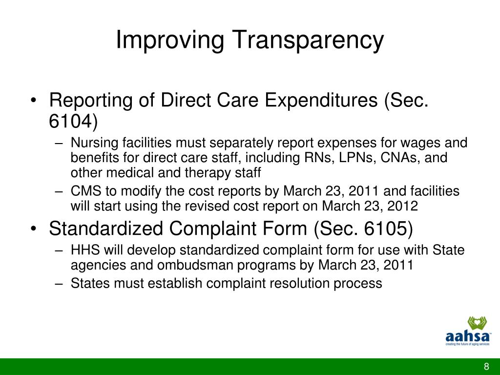 Improving Transparency • Reporting of Direct Care Expenditures (Sec. 6104) • Nursing facilities must separately report expenses for wages and benefits for direct care staff, including RNs, LPNs, CNAs, and other medical and therapy staff • CMS to modify the cost reports by March 23, 2011 and facilities will start using the revised cost report on March 23, 2012 • Standardized Complaint Form (Sec. 6105) • HHS will develop standardized complaint form for use with State agencies and ombudsman programs by March 23, 2011 • States must establish complaint resolution process