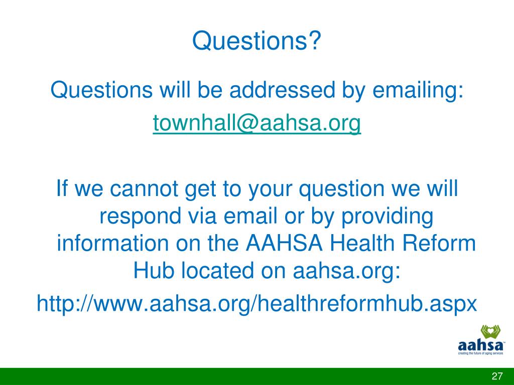 Questions? Questions will be addressed by emailing: townhall@aahsa.org If we cannot get to your question we will respond via email or by providing information on the AAHSA Health Reform Hub located on aahsa.org: http://www.aahsa.org/healthreformhub.aspx