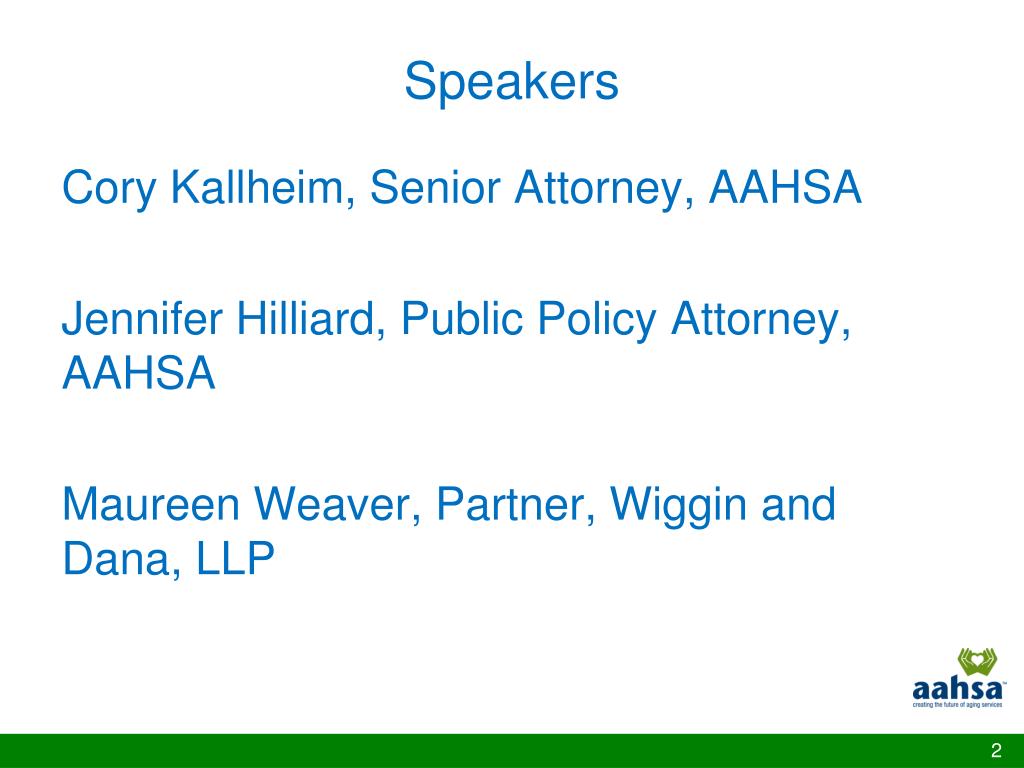Speakers Cory Kallheim, Senior Attorney, AAHSA Jennifer Hilliard, Public Policy Attorney, AAHSA Maureen Weaver, Partner, Wiggin and Dana, LLP