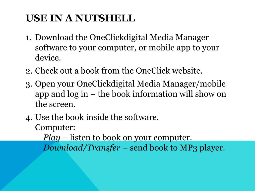 Use in a nutshell • Download the OneClickdigital Media Manager software to your computer, or mobile app to your device. • Check out a book from the OneClick website. • Open your OneClickdigital Media Manager/mobile app and log in – the book information will show on the screen. • Use the book inside the software.Computer: Play – listen to book on your computer. Download/Transfer – send book to MP3 player.