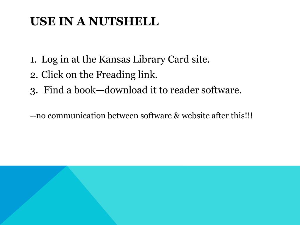 Use in a nutshell • Log in at the Kansas Library Card site. • Click on the Freading link. • Find a book—download it to reader software. • --no communication between software & website after this!!!
