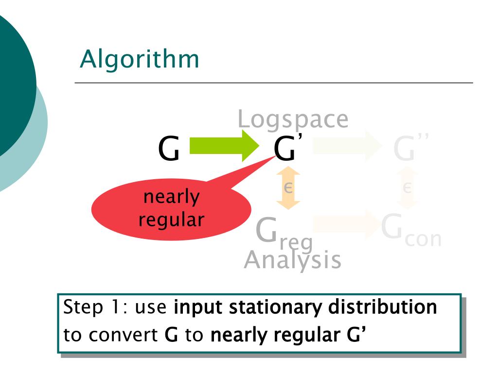 Algorithm Logspace G G’ G’’ ε ε nearly regular Gcon Greg Analysis Step 1: use input stationary distribution to convert G to nearly regularG’