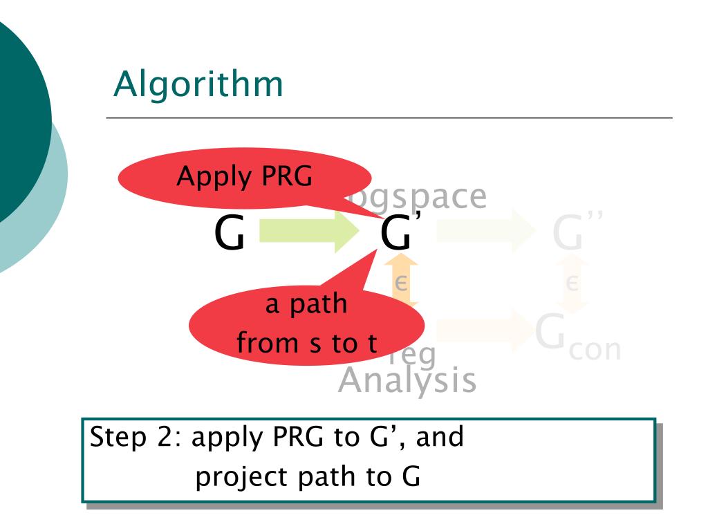 Algorithm Apply PRG Logspace G G’ G’’ ε ε a path from s to t Gcon Greg Analysis Step 2: apply PRG to G’, and project path to G