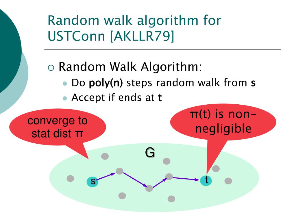 G t s Random walk algorithm for USTConn [AKLLR79] • Random Walk Algorithm: • Do poly(n) steps random walk from s • Accept if ends at t π(t) is non-negligible converge to stat dist π